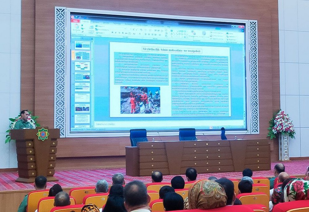 The Main Department of Civil Defense and Rescue of the Ministry of Defense periodically organizes short-term training courses and lectures on emergencies in educational institutions, the Health Service, and with the staff of the provinces and Ashgabat City Civil Defense and Rescue Departments. The ministry also organizes "Young Rescuer" contests among children.