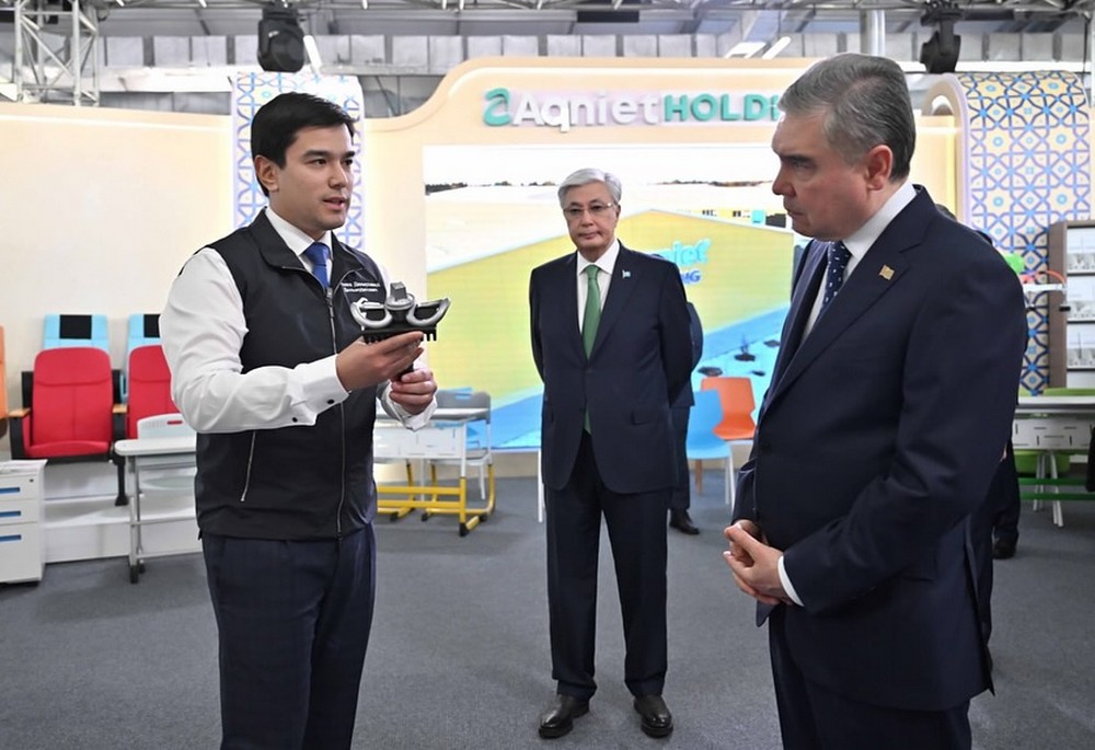Гурбангулы Бердымухамедов и Касым-Жомарт Токаев также осмотрели выставку казахстанских производителей, представляющих продукцию космической, машиностроительной, металлургической, строительной, лёгкой, пищевой и химической отраслей.