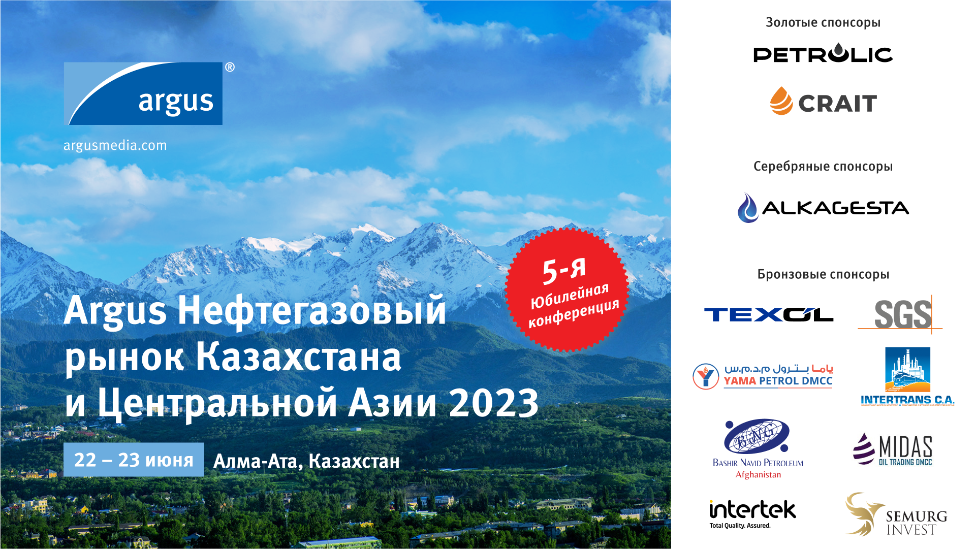 “Argus” garaşsyz nyrh agentligi 22-23-nji iýunda Almatyda geçiriljek "Argus Gazagystanyň we Merkezi Aziýanyň nebit-gaz bazary - 2023" V halkara konferensiýasyna gatnaşmaga çagyrýar.
