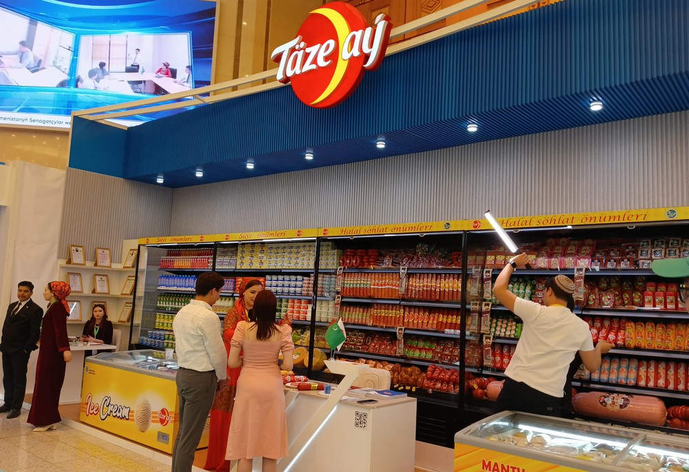 “Täze Aý” kärhanasy Türkmenistanyň Senagatçylar we telekeçiler birleşmesiniň 17 ýyllygy mynasybetli geçirilen sergide täze önümini – göle we towuk eti garylyp taýýarlanylan “Aşgabat” atly 30 kilogramlyk şöhlatyny tanyşdyrdy.